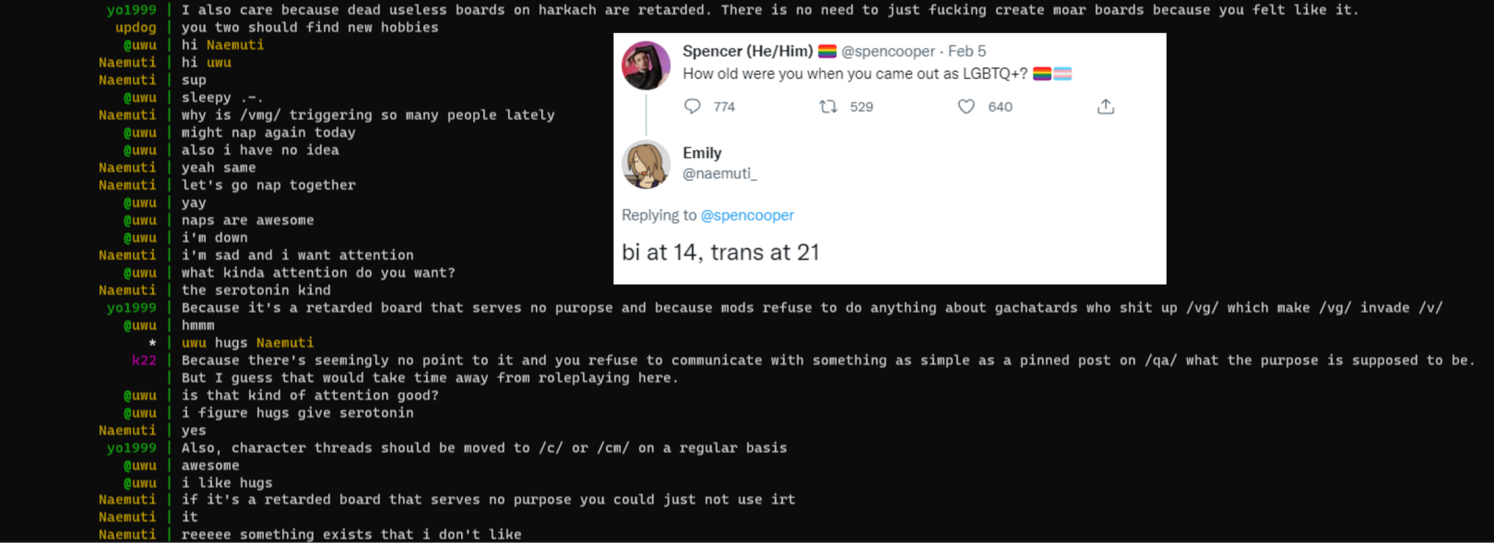 >>734383037>You unironically do not belong on 4chan if you try to tone police someone because they made fun of your precious gooning media.I've been on 4chan longer than you have been alive. 4chan is an anime website.
