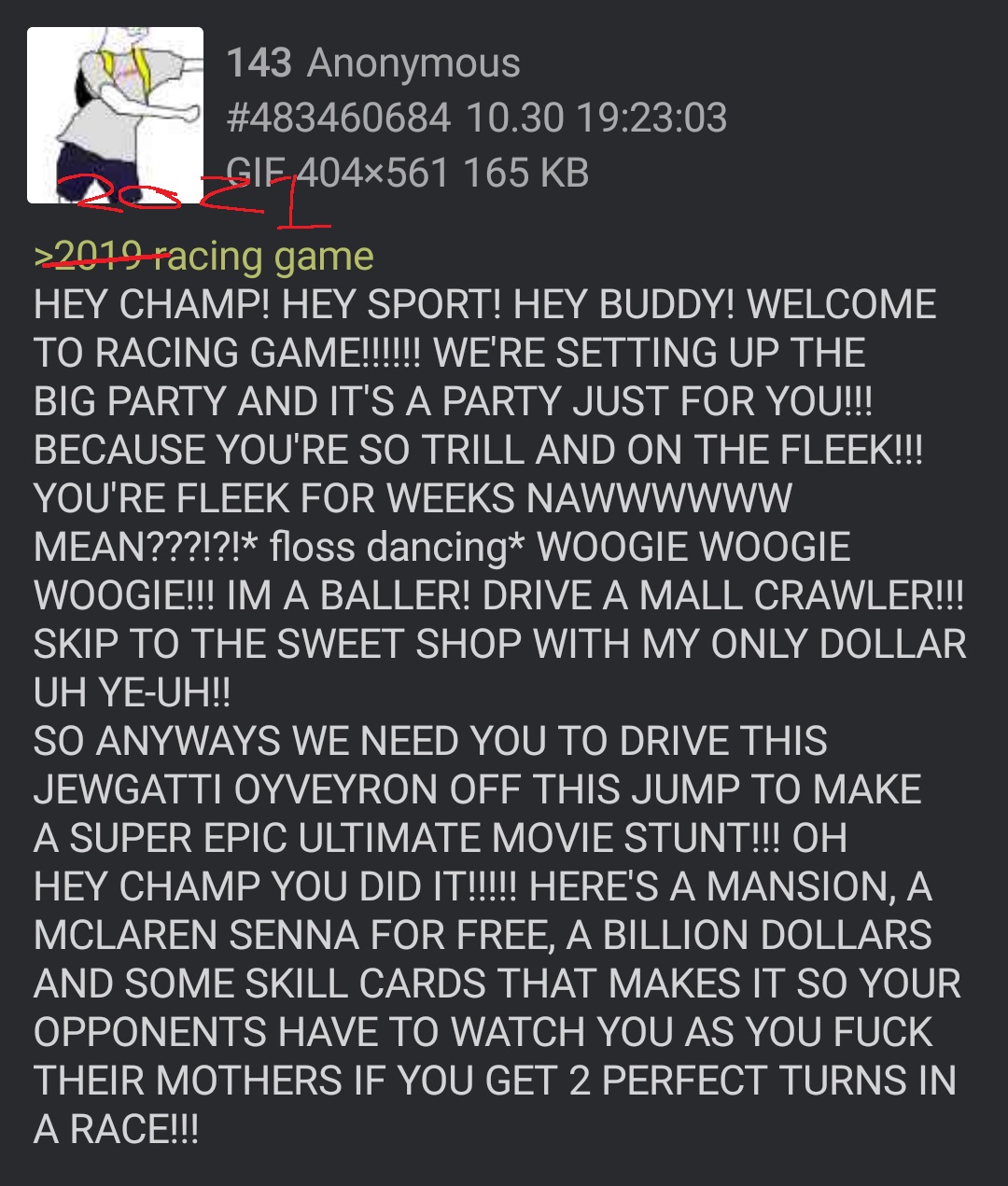 KONICHIWAAAAAAAAAA!!! GREATU SPORTU GOMENASAI AND WERCOME TO RACING GAMU WERE SETTING UP BIGGA PARTY JUSTA FOR YOU SUGOOIII CAUSE YOU SO THRILL YOU SO FREEK YOU FREEK OF THE WEEK NAAAAWW MEAAAN???!! ฅ^>⩊<^ ฅ YOOOOOOOOOOOOHOOOOOO IM A BARRER DRIVE MY SUBARU FORESTER TO THE HYAKKIN WITH MY ONRY DORRA WOOOO YE UH (˶˃ ᵕ ˂˶)SO ANYWAY I NEED YOU TO DRIVE THIS GOYOTA TRUANNY OFF THISA JUMP TO MAKE SUPER EPICU MOVIE STUNT!!!! :O OH HEY CHAMPU YOU DID IT! HERES TOKYO APARTMENT!! HERES ONE GORIRRION YEN (12$) AND HERES A BUNCH OF ANIME SKIRRCARDS THAT MAKE YOUR OPPONENTS COMMIT SEPPUKU WHIRE YOU NTR THEIR MOTHERS IF YOU GET 2 PERFECTU TURNS IN A RACE!!! \( ̄▽ ̄)/