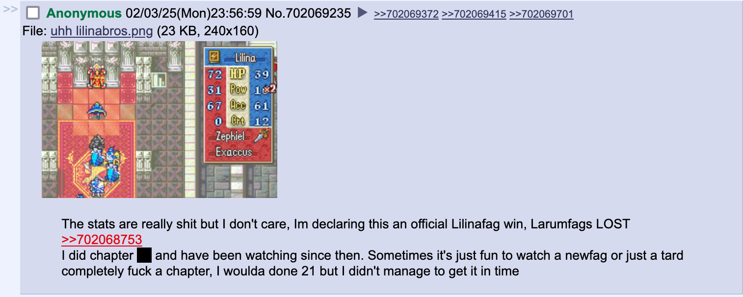 >rutger is good>lilina is goodWhy is it that fe6 gets the most retarded arguments?The xander backpack argument was more intelligent than this shit