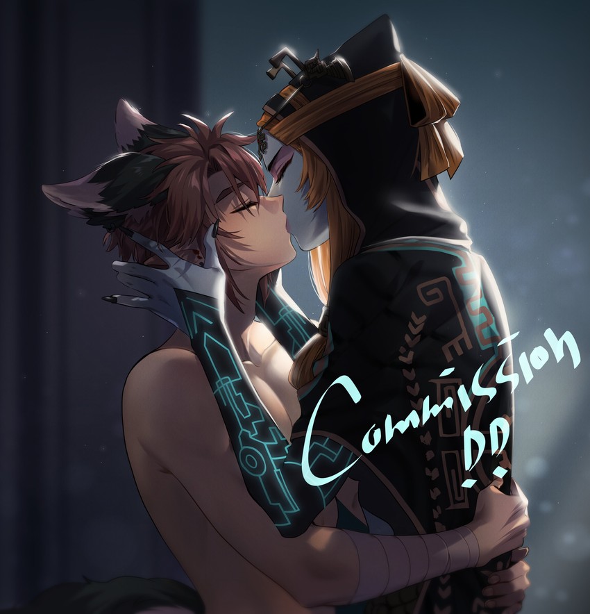 I need art of Link sitting on a throne in the Twilight Realm with Midna on his lap with a collar around her neck.