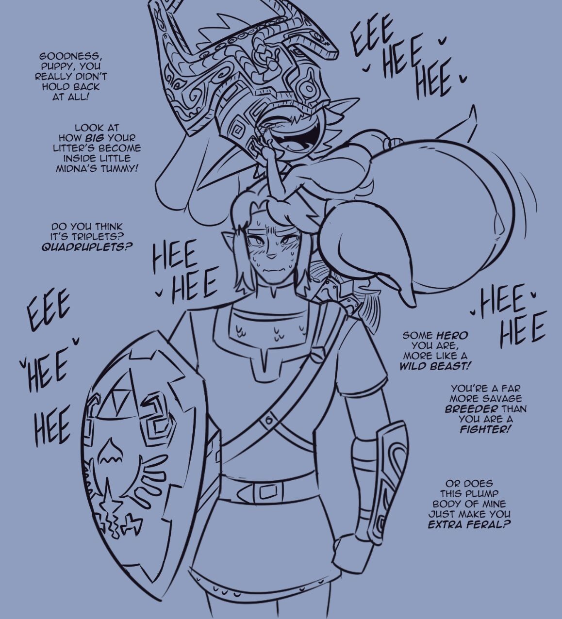 cumming endlessly into imp Midna who acts as a voodoo doll of sorts to true Midna, imp Midna swelling like a condom stuck to a faucet and true Midna following suit until the two of them both finally blow (non-lethally)