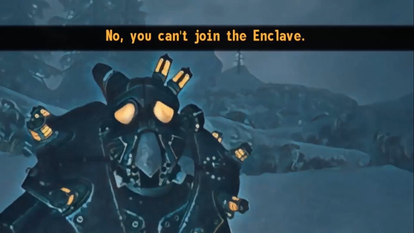 >install Morrowind>people tell me I should roleplay and create my own fun>decide to create a female dunmer alchemist, who is morally dubious and funds her high-fashion lifestyle by lending her talents to the bad guys>she is also charismatic, good at speechcraft, bartering, a non-combatant>land in Seyda Neen>refuse to help the local thugs shake down the local Elves (my people!) for tax money>hear this dump is a hub for smugglers>go into the smuggler's den 20 meters from town to join their operations or at least do quests for them to gain reputation>these psychopaths attack a defenseless, beautiful dunmer woman on sight>can't yield to them, can't explain I want to help them, even theoretically calming them down with a scroll wouldn't unlock any interesting dialogue options>if you kill them, you can't even do something "evil" like sell their slaves, you can only free them>can't even join the Camonna Tong either, they tell me to kill myself, even If I spam admire to level speechcraft to 100 and leave their disposition at max after talking to themAh yes. "Roleplay"