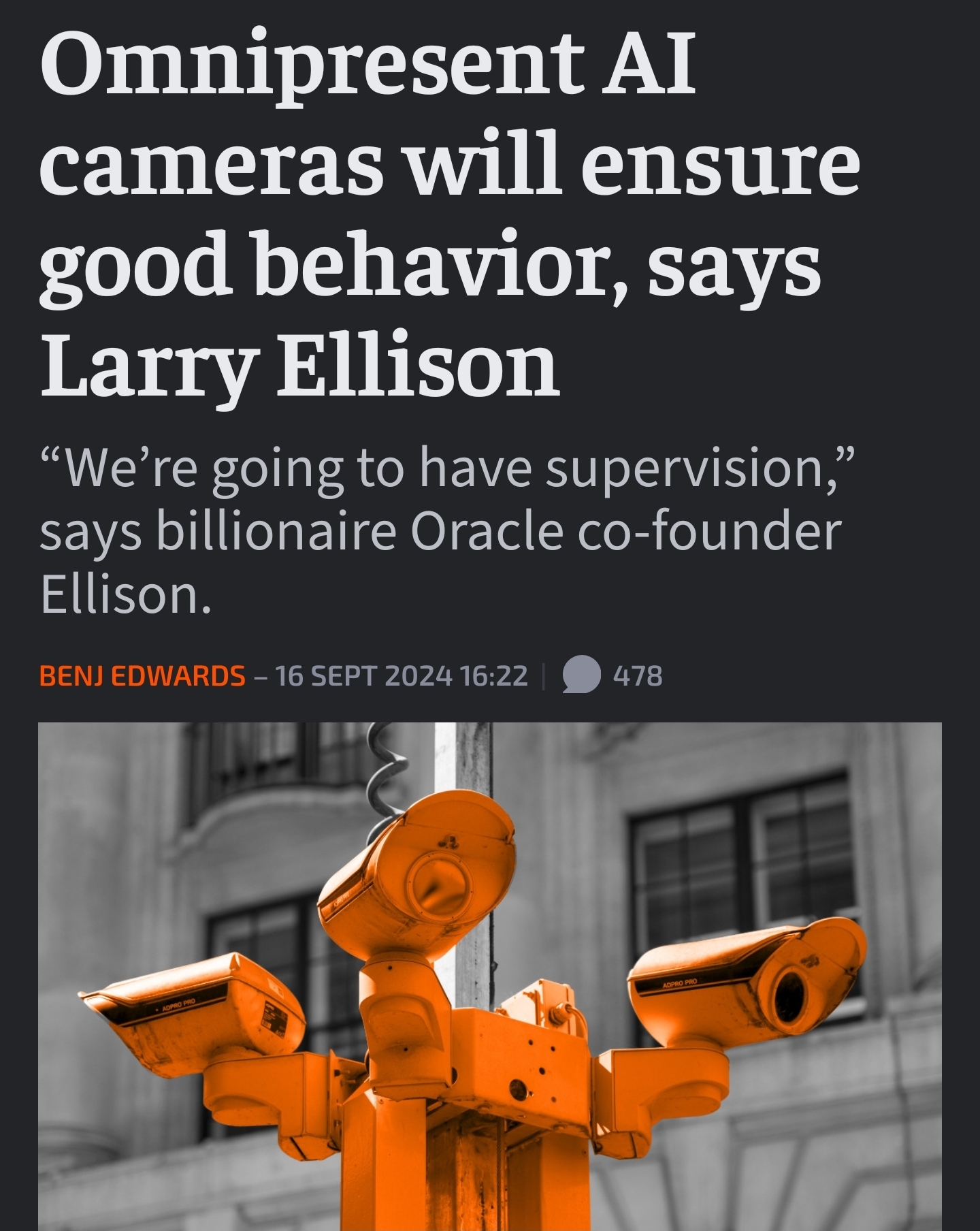 >>734676678More that that jeet I was talking to, at least.Also, I'm aware of that shit in your pictture. The Flock systems (I think that's what it was called) in Texas were basically quoted as saying they have that intention exactly. The whole "constant surveillance means good behavior" thing. I just think it'll make people wear face coverings and walk to where the places they're going to misbehave more.