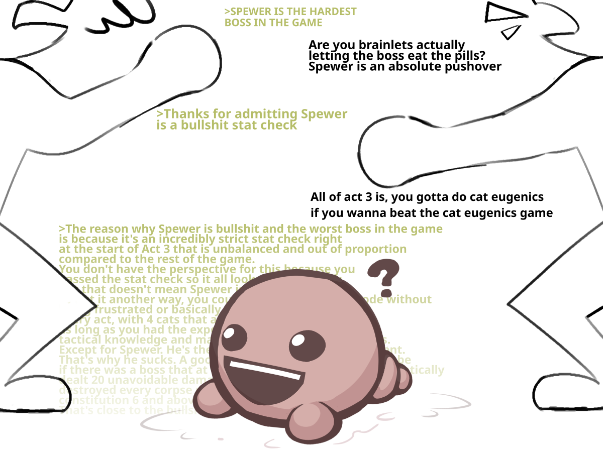 Okay I genuinely have to ask since I don't get it.What's the deal people have with spewer?I'm not good at this game, I don't pretend to be. I have some good cats but I mostly just throw my good ones into a 45 stim room and the rest into a -50 comfort room and pick the good ones when I play that aren't already dead.Dybbuk fucked me when he killed half my party before king.Gambit fucked me once when my minions proceeded to consistantly spawn and reroll his dice into 5/6's.Coven fucked me when I had a really slow team that couldnt out of the feast cone.Dread fucked me a lot on hard because the legs having the depression or bouncy debuff is kinda bullshit.the 50 health shit cats also kinda suck if your team ended up bad.Chief unga bunga fucked me a lot because concussions really suck if you only take int buffs around what spells you cast each turn.But I haven't ever lost to spewer a single time. Even with the shitty lava stacking 16-20 fire on my cats I usually win and heal up on the first 2 future/past fights.The only bosses that have genuinely fucked me over so hard I couldnt do anything from turn 1 was the creator copying a cat I couldnt kill in time before it kills me because of turn order. C-1000 doing something simmilar, and King chain webbing the only good cat on my team.Even on my first time vs mother I only died once because I got fucked up by the hard path before her. My first time I had thorns out the ass and just killed all the heralds by doing nothing and that was enough for me to suss out that I should atleast bring a little AOE if I havr a cardinally locked damage dealer like a thief.Chubs and nubs filtered me a lot early on but I got over them and it was mostly because I accidentally bred the entire dex stat out of all my cats and had to beat them with mediocre fighters until I did a purge.Bumblefoot isnt usually too bad but I took a melee only team once to the bunker. I think id rather deal with the crater under those conditions.