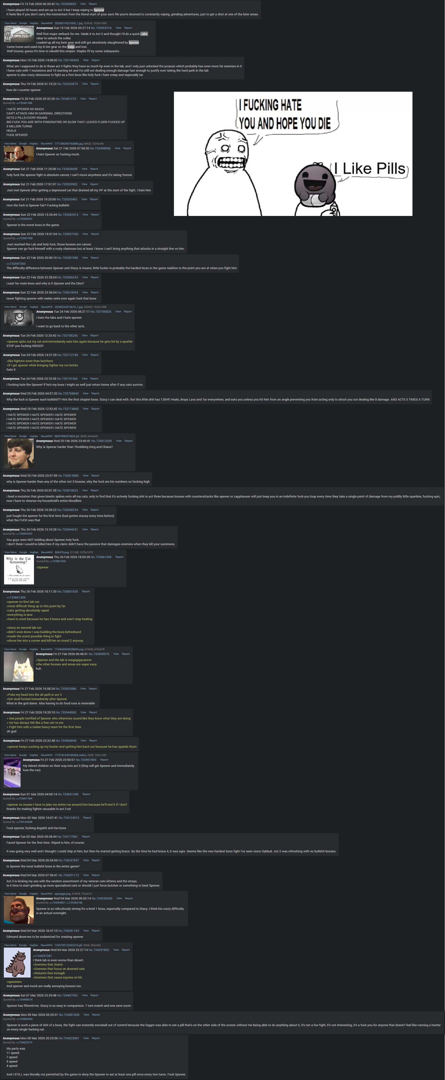 >>734728708The thread shitter's complaints about Spewer is that you can't beat Spewer with a cat who has 1-1-1-1-1-1 in its stats