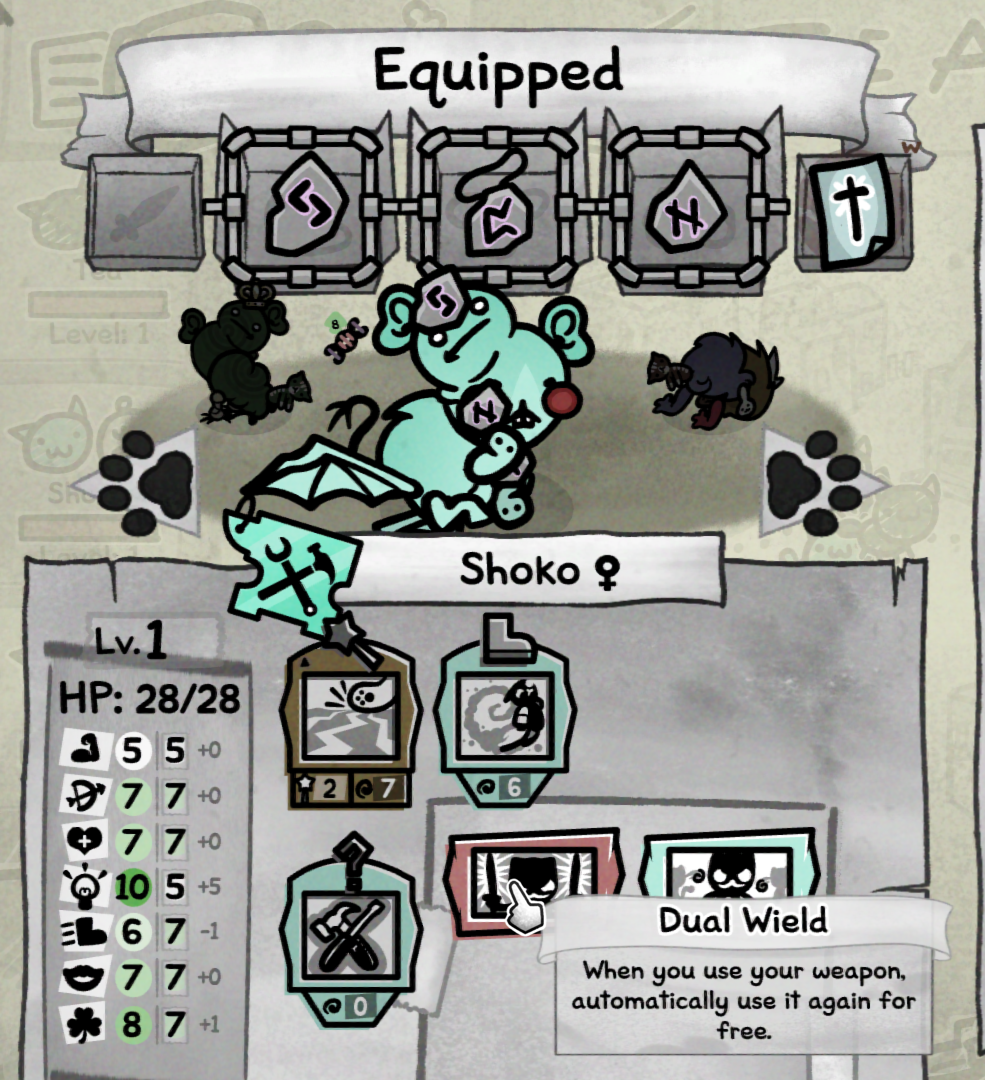 >Don't bother with Monk for hours after I unlock it because I figure it'd just be a half-assed version of either Fighter/Butcher or Hunter depending on the form>Decide to finally take a crack at it while I'm running through Act 1 again to complete both the Ultra Vision and that dice sidequest at onceWait this guy actually fucking rocks, chaining together attacks is insanely fun and the damage isn't half bad either. I lucked into getting that swirly eyed mutation that applies Confuse on Basic Attacks, on top of it being a a high charisma cat that landed on both Dancing Lights and Combo Pull so I was dishing out a shitton of extra damage a turn while also utterly debilitating bosses. This class is apparently super reliant on passives and abilities (didn't know both the weapon and trinket slots were fixed before using it, whoops) so I was even at a disadvantage using it with the Dice item and it still ended up strong. Consider me a believer