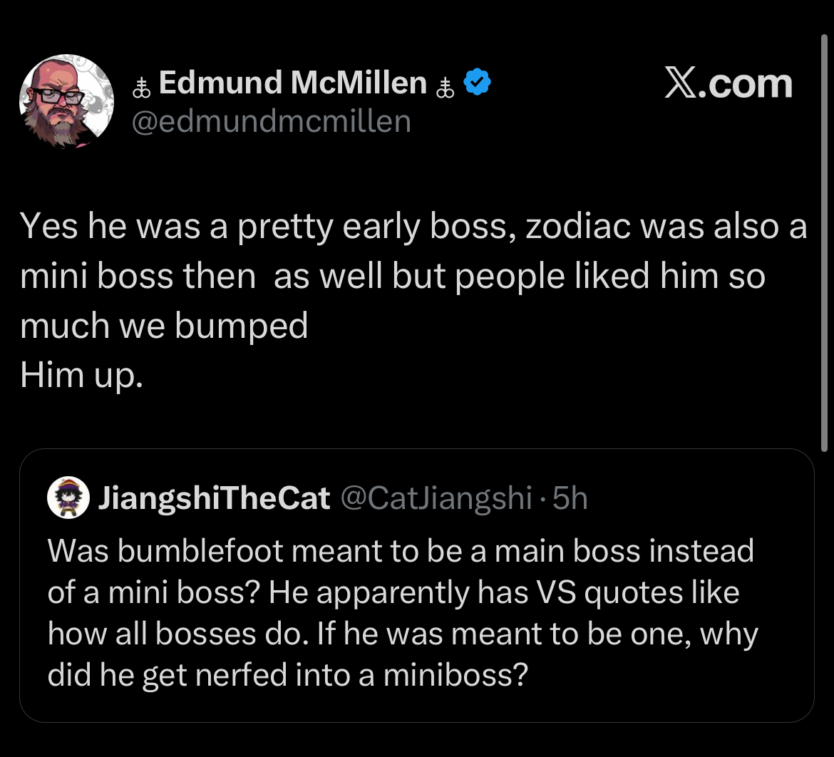 >>734731812I haven't lost against Spewer so far either, but I have had runs that made the fight insufferably long, and overall I think Spewer is a very boring and poorly designed fight anyway. It's really strange how the minibosses have far more engaging gimmicks than most of the chapter bosses.