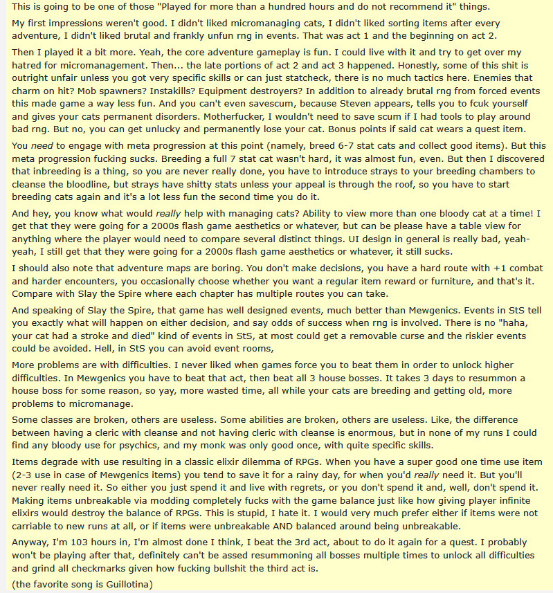 >>734726416First of all Spewer is literally baby tier easy, if you lose to him your cats just sucked dick my real problem with your post is>otherwise well designed gameIts padded out as fuck by needing a stupid amount of cats to upgrade shit AND having to share retired cats between butch and frank alongside a slew of other things>Get to new act>Do first level, ace it>ok now go home>no despite these cats being good enough to molest the rest of the act you have to go home now just uuuuuh just because ok????>repeat for 2nd acts of other routes in itI'm 80 hours with only the last part of act 3 to go and its kind of tiresome at this point, the 99 coin cap on runs is shit and only exists to make sidequests seem like a good idea because they give more money.I really do like the game but it would genuinely be much better if the required cats for most basic features like storage/cat info/housing were slashed by 50-80% or something.