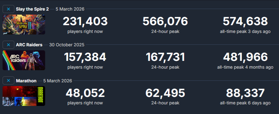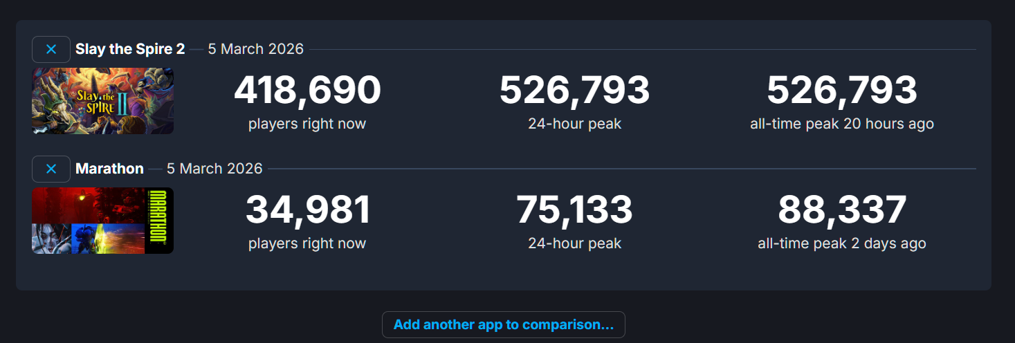 >Marathon is $40 paid entry, hit 88k, and is still holding 35k+ a week later with actual patches dropping.