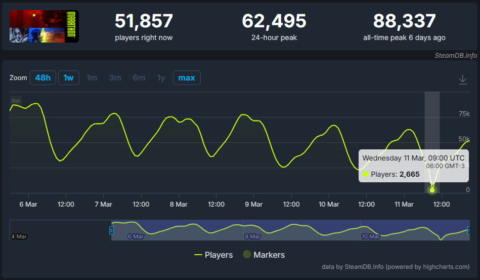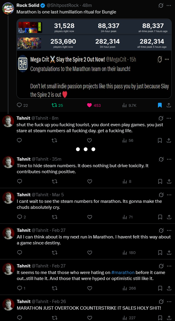 Highguard was free-to-play, spiked to 97k, then died in like two weeks and is sitting at ~250-300 concurrent right now. Marathon is $40 paid entry, hit 88k, and is still holding 35k+ a week later with actual patches dropping. Not even close to the same situation.You're still proving the guy's point. By obsessing this hard and moving the goalposts to one meaningless metric, you're just setting yourself up for max humiliation if it doesn't instantly crater. Just let it flop naturally like you claim you want.