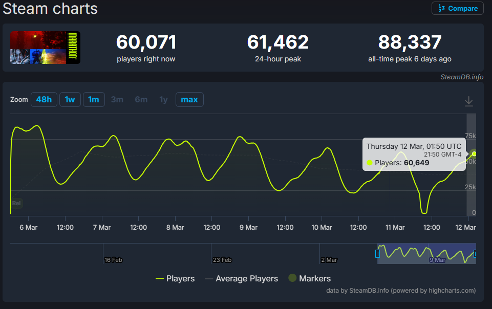 >Yeah, it just passed 60k. It might even slightly exceed yesterday's peak on the strength of the patch, but it won't be by much.