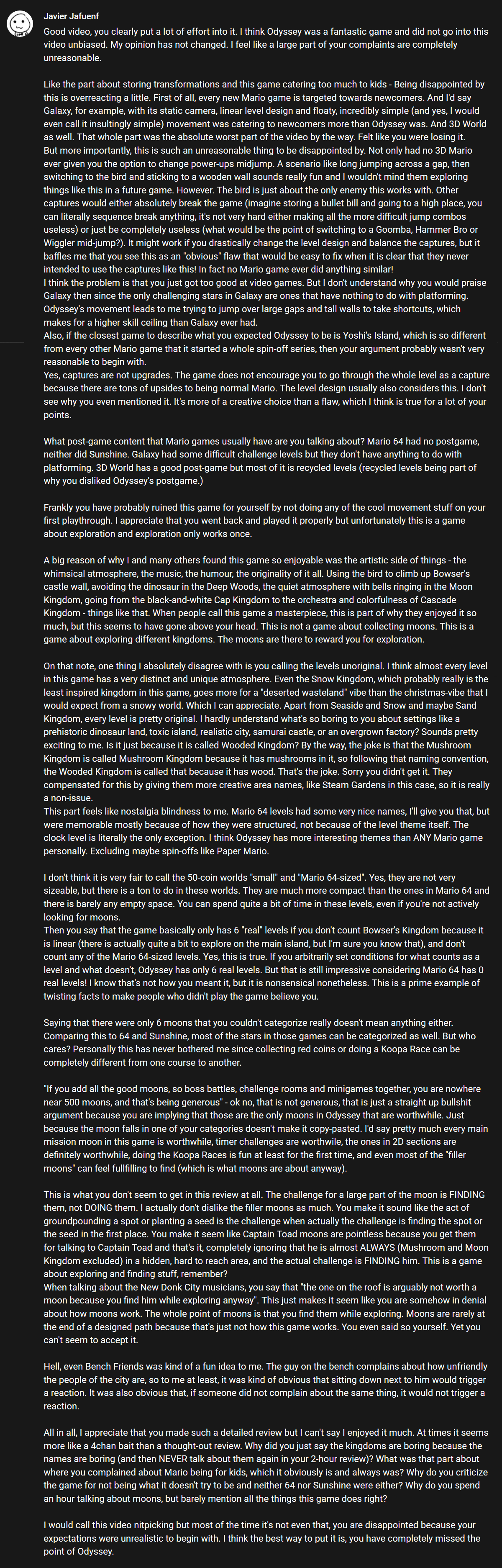 The efforts to take down a random video on Odyssey here are pathetic because everyone is acting as if they have some keen insight for real criticism and are just so enlightened that they can identify how XYZ youtuber's points are bad because XYZ reason. When in reality it's as simple as you enjoying a children's video game and disagreeing with the guy who didn't like the children's video game. There is no real insight being had here, no like actual taste for video game analysis where weak criticism is being attacked and strong criticism is being uplifted. Take a look at >>734916187 . This is basically that in a nutshell. Someone who likes Odyssey is never going to change their mind because of a video. Instead, they will nitpick the nitpicks in an endless back-and-forth needling the things they like or dislike, forever. And no insight will ever actually be had here. Because for all people online like to posture about being deep thinkers with cutting insight, at the end of they day their intuitions are always correct and anyone who disagrees with them is retarded and anyone who agrees with them is smart. Everything else is posturing to stroke their ego.