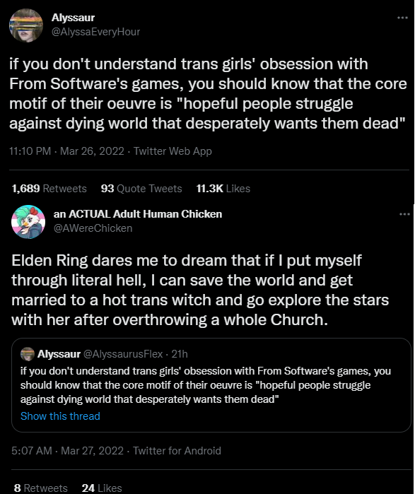 Malenia btfo’d the big man RadahnA team of all female ninjas btfo’d the big man Godwyn, orchestrated by strong smart gurl Ranni Only the female albinaurics riding their wolves can save their race! With the help of a giant sleeping woman no less Female ancestral followers are bigger than the males AND the more magical!Demi humans are led by an enormous female “queen” Those bat creatures are led by singing female bats Cleanrot knights are all female and said to be the best fighters ever / totally better than Radahn’s men The spells with the highest faith/int are from women or some feminine twink A smart strong womyn took over the men’s magic club because she’s sooo much smarter than the dumb men I could go on