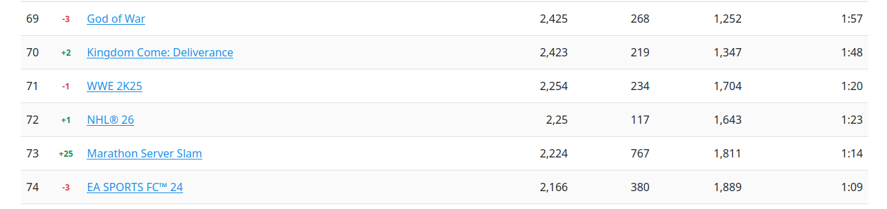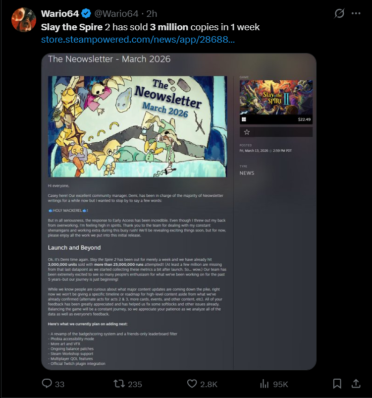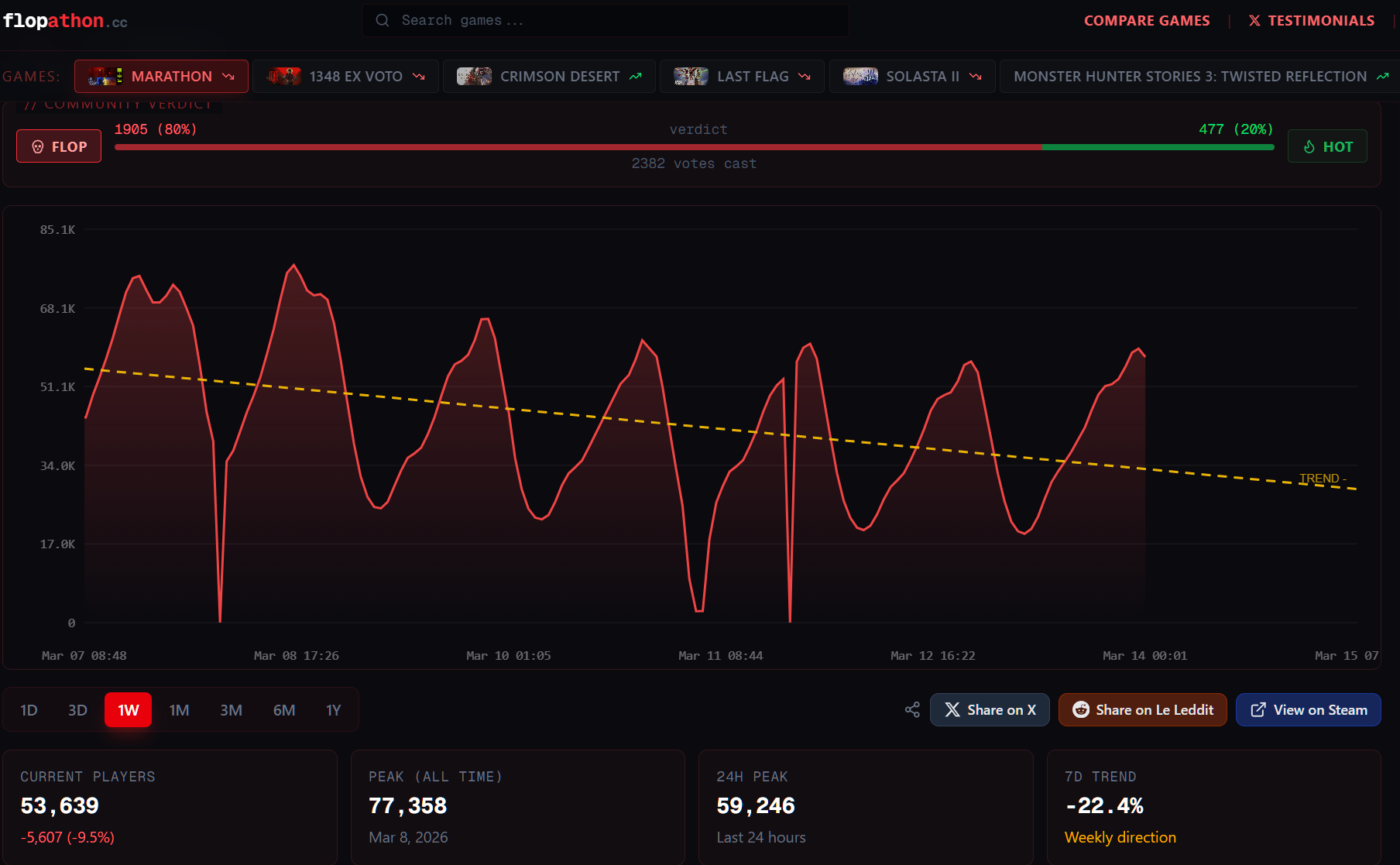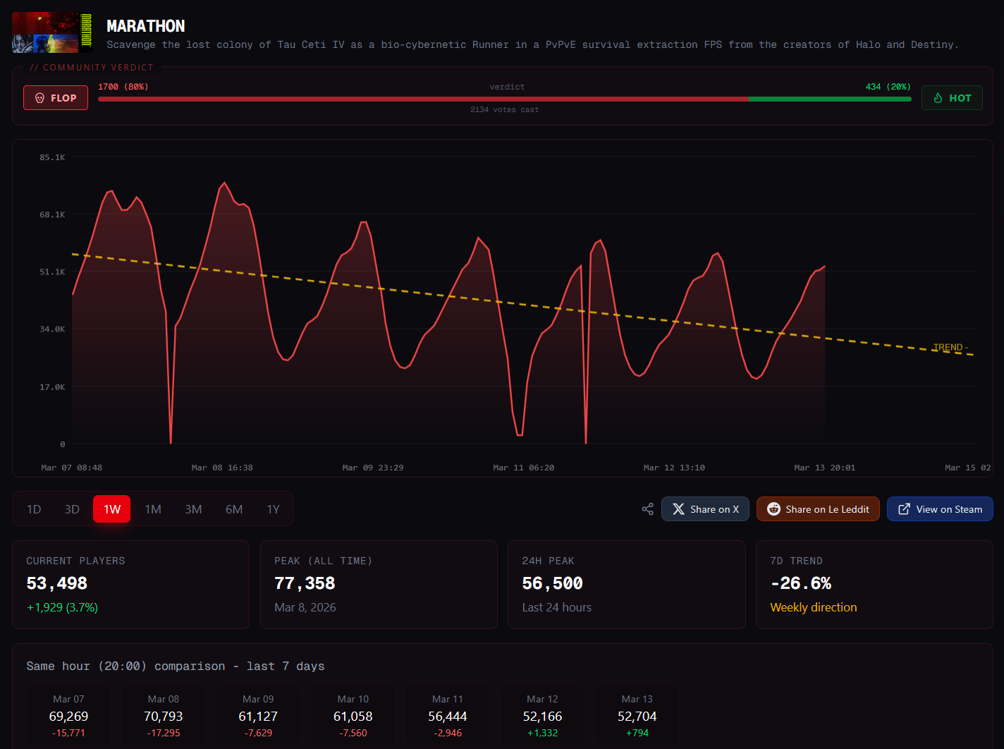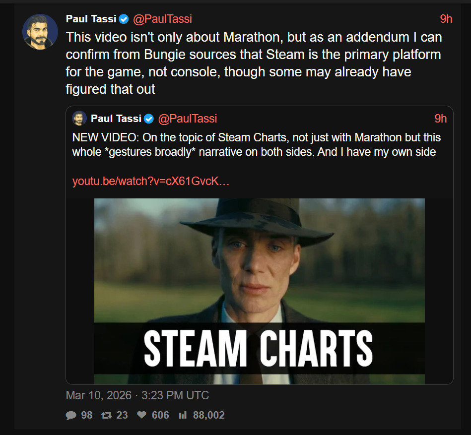 >>734919118>2 MILLION>5 minute queues in playstationNo way it sold 1M on Steam unless half a million straight up doesn't boot the game.STS2 just announced 3M sales, and it has 556k daily peak players, so about 20% of buyersMarathon is struggling to break 60k max daily, which points to about 300k sales.The true number is likely even lower, since multiplayer games tend to have overall longer session times, meaning more overlap for higher concurrent playercounts.That shit probably hasn't broken a quarter million sales on PC. And at best PS5 sales are 100k.