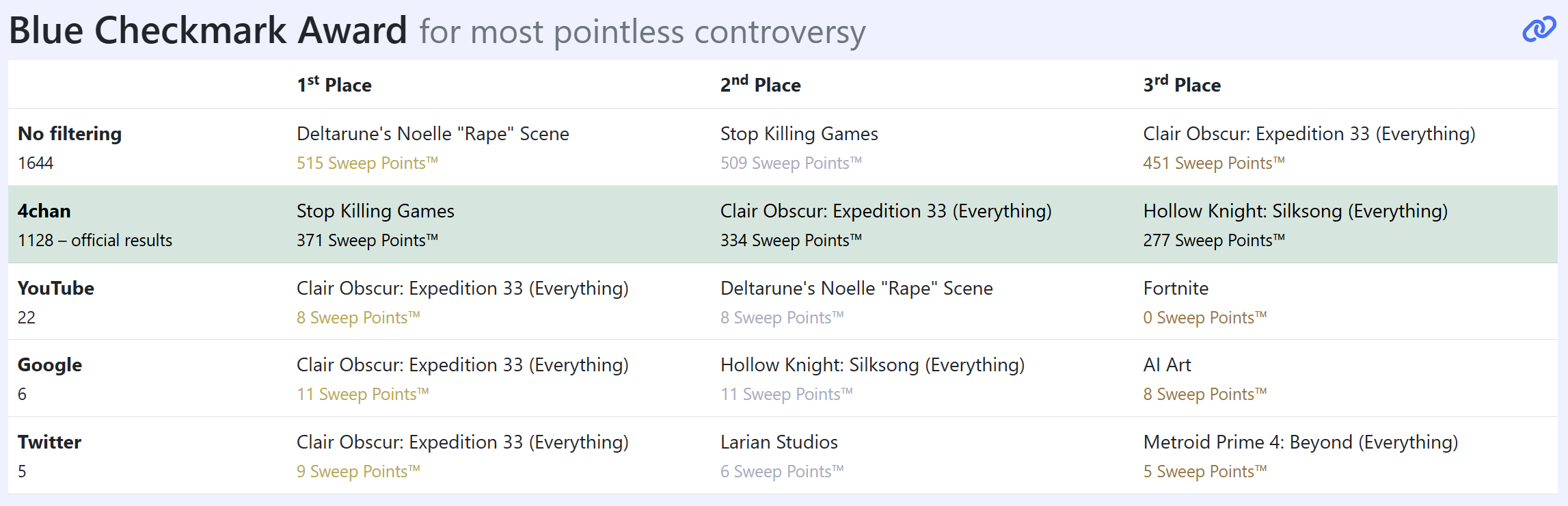 If 501 liked A and 499 liked B, that's 2 sweep points. Low SP counts tend to explain close races rather than low participation