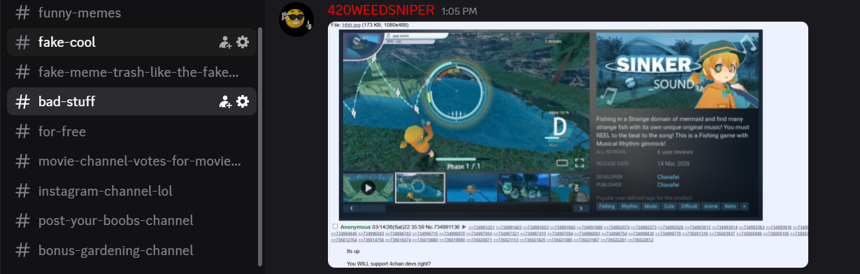 >4chan devMost likely it's another grooming game. It makes sense now why they were allowed to spam the other shitty fishing game.