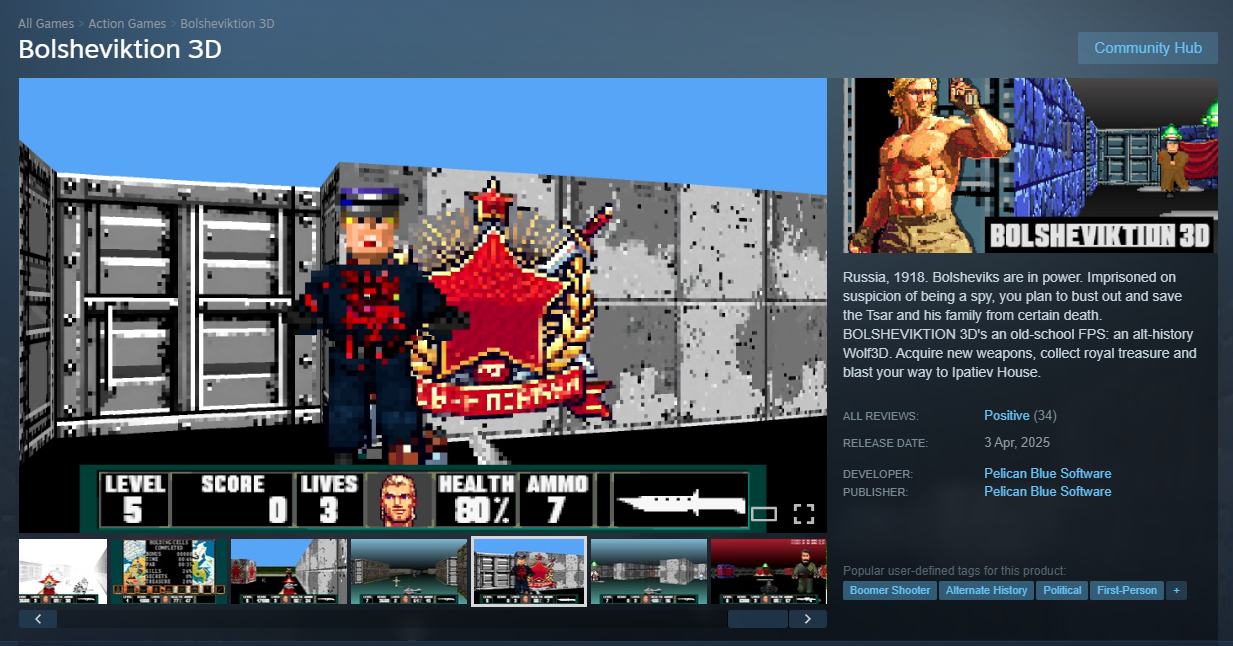 https://store.steampowered.com/app/3575610/Bolsheviktion_3D/This is hands down the most lazy 4chan dev job game i have played as of recent its a doom clone "alt history" of the russian revolution where you save the tsar, uses AI alot but redeems itself in certain ways like weapons etc but overall its crap the controls are janky and the level design is lazy like one level is set in a house but theres no ceiling yet lamps hang from the ceiling.