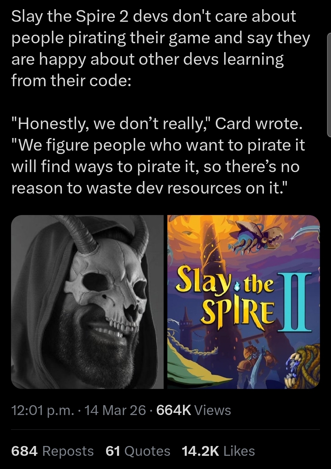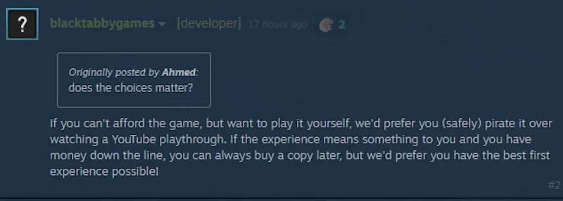 Honestly whether your game is super successful or not saying shit like that is such an easy way to look based and combat piracy in a roundabout way by making people like you enough to want to buy, unlike faggots like Jonathan blow who just whine about losing sales