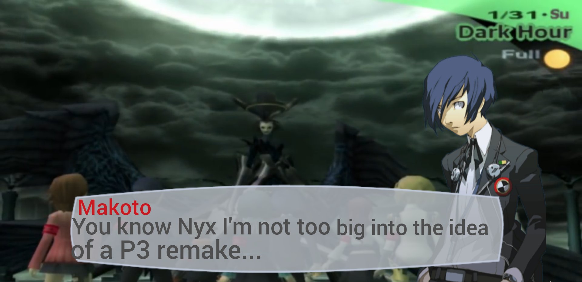 I like it because it doesn't replace the older versions. The fact that it's shittier in some areas means I have an excuse to replay both this, and FES.Is this a retarded train of thought? Yeah, probably, but I just really like Persona 3.