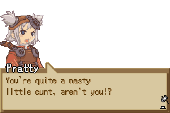 >>735012890The setting was much duller than the steampunk island city of Wystern. The characters seemed less interesting, too. I was hyped for clashes of ideals with the angsty abused summons, but everything gets pinned on the lukewarm villains and nothing much comes of it.It also has generic weapon durability encouraging you to brainlessly mash through menus to repair. In Swordcraft Story 1 you automatically maintain weapons outside of battle, making it the only RPG I know where weapon durability didn't make the game worse.2's music was fucking sick, though