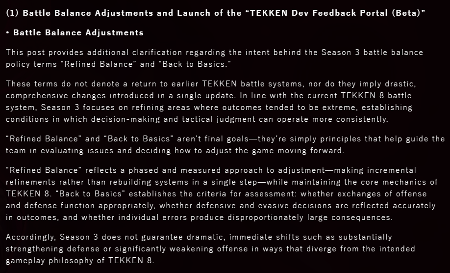 >>734998064nothing will change >“Refined Balance” and “Back to Basics.” do not denote a return to earlier TEKKEN battle systems, nor do they imply drastic, comprehensive changes introduced in a single update.>“Refined Balance” and “Back to Basics” aren’t final goals—they’re simply principles that help guide the team in evaluating issues and deciding how to adjust the game moving forward.>“Refined Balance” reflects a phased and measured approach to adjustment—making incremental refinements rather than rebuilding systems in a single step—while maintaining the core mechanics of TEKKEN 8.they're doing small adjustments like removal of wall splat after a heat smash, and removal of powerup activation when heat ends if heat is what activated that power up>“Back to Basics” establishes the criteria for assessment: whether exchanges of offense and defense function appropriately, whether defensive and evasive decisions are reflected accurately in outcomes, and whether individual errors produce disproportionately large consequences.this is literally what they've already been doing in previous updatesNOTHING WILL CHANGE