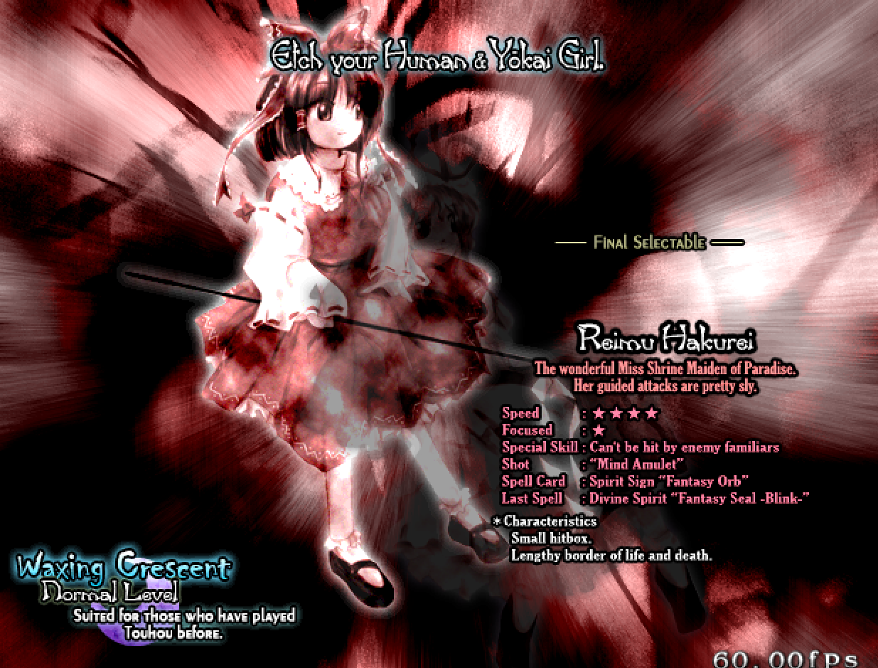>>735000016Get this torrent, it has all the games.https://nyaa.si/view/2057254Getting started:1. Extract Touhou 6 Embodiment of Scarlet Devil, it's the first Windows game and has a lot of iconic characters that you might have seen in fanart/fangames.2. Extract the "thcrap" zip, enter the "thcrap" folder and open "thcrap.exe".3. Basically this is a tool to get the games into english, just click Next, select English and then the game you want to translate (if nothing shows up, click to select the game folder).4. It will install the translation and create a new shortcut, open the shortcut to play the game in english.Some gameplay tips:>After you're in-game, go in config and increase your number of lives, this option is only available in the first few Windows games. Some people will call it cheating but do it anyway, they're like training wheels.>Start in Normal Mode, Marisa is stronger but Reimu is simpler to use since she has homing shot.>Hold SHIFT to enter focus mode, you move slowly and your shot style changes (typically more powerful but it covers less of the screen).>Remember to USE BOMBS when you need to, you get a new set of bombs when you die so if you don't use your bombs, you're wasting them.>You play MOSTLY at the bottom of the screen but don't get too comfortable there, you can actually dodge some patterns better by going forward towards the center area (middle or sides).>Some bullets will be aimed directly at your character, depending on the situation you want to either move really slowly so they won't cover the whole screen, or you want to move really fast to different angles so you essentially "create" openings to pass through.>If you clear the game at least once, you can practice later stages via the Training Mode, it can be productive to practice the harder stages (like Stage 4, 5 and 6) this way rather than restarting from Stage 1 all the time.>Finish without using continues (called 1CC) to get a good ending, this is the endgame.