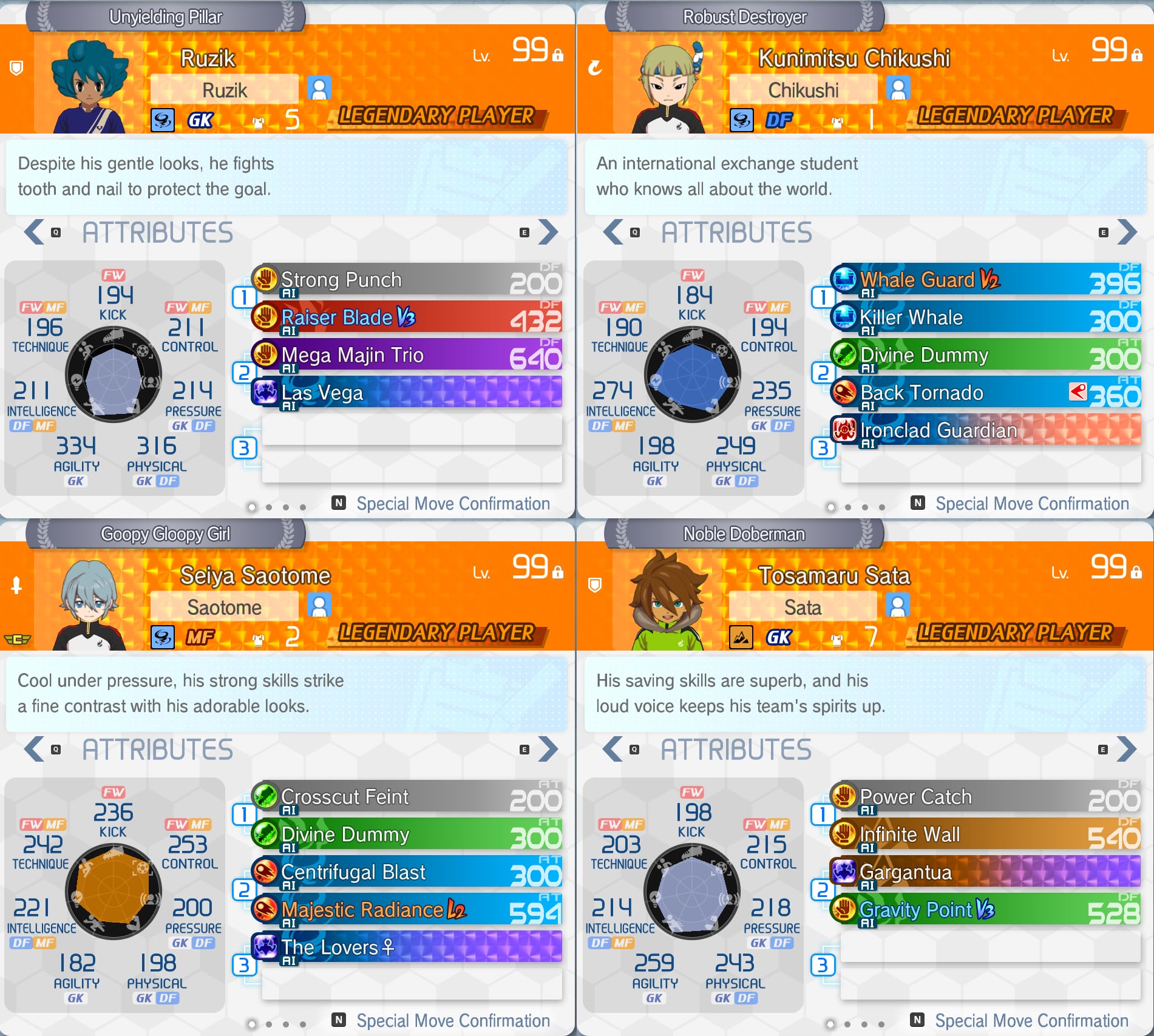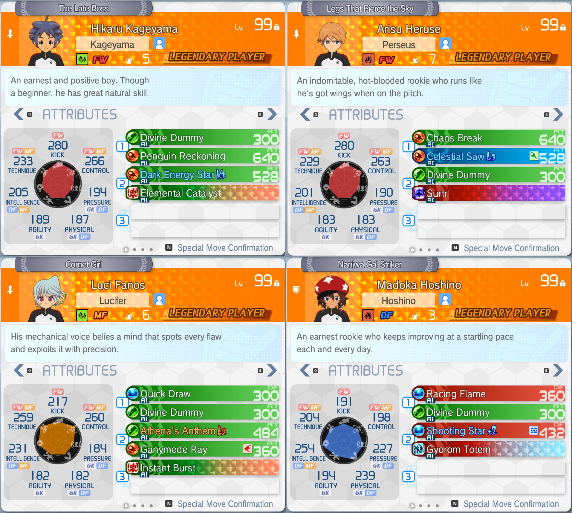 Completed another 4 cute boys for the Idol team, this time the FWs, 1 MF and a DF.Though I wonder if I should give Perseus a Fire shot Hissatsu or if his Kenshin is good enough