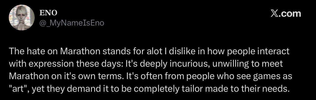 I'm a chud and I like marathon because the game is fun to play and I like the weird artstyle. I guess I just don't pay enough attention to the meta to know if the game is woke or not because usually when the devs are woke it bleeds into the game and I just don't see it.