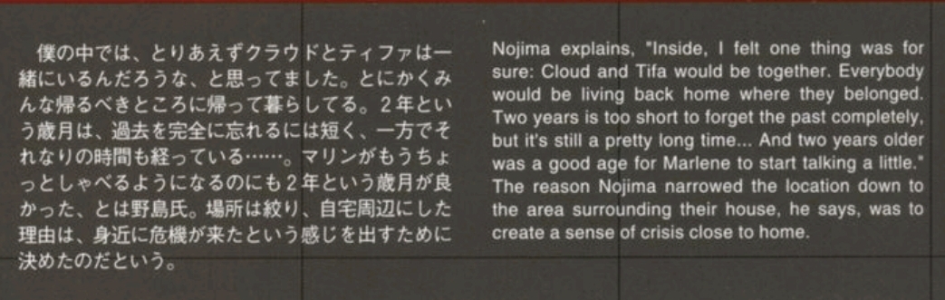 >>735005156The "sex" scene was proposed by a writer external to the game and Kitase and Nojima rejected it.What makes people have hope they will make a rejected draft canon? Is it mental illness?