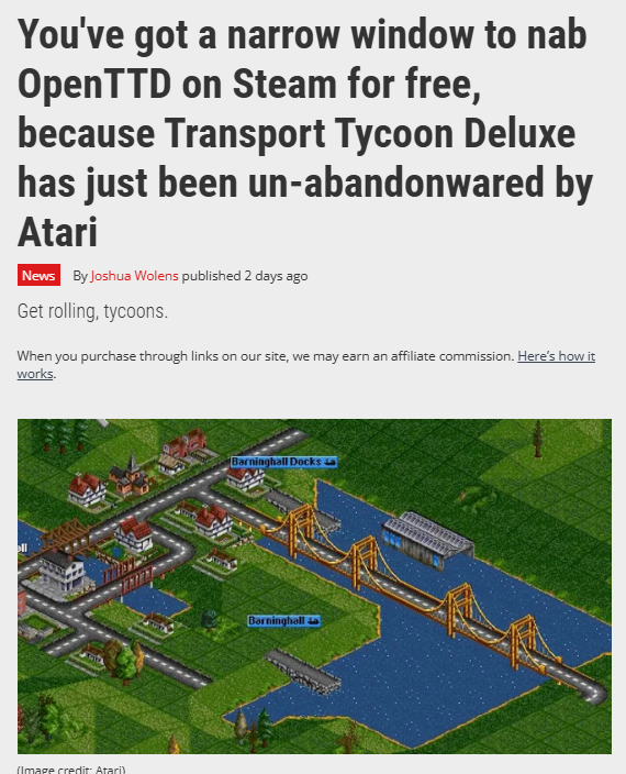 >>735027632>just OpenTTD stops being downloadable from Steam without buying the original TTD, which Atari bundles with OpenTTD to make it work on modern machinesAtari's repackaged original runs in a DOS emulator. It doesn't use OpenTTD.