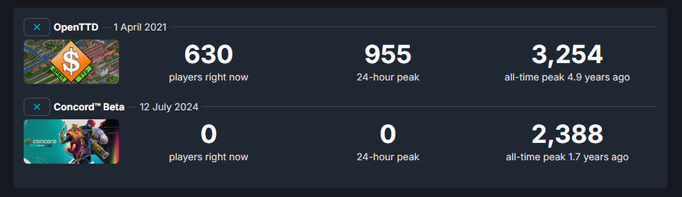 >>735005760>Absolutely everyone heard about Concord>No one heard that OpenTTD was released on Steam even though it was more popularWe live in a society