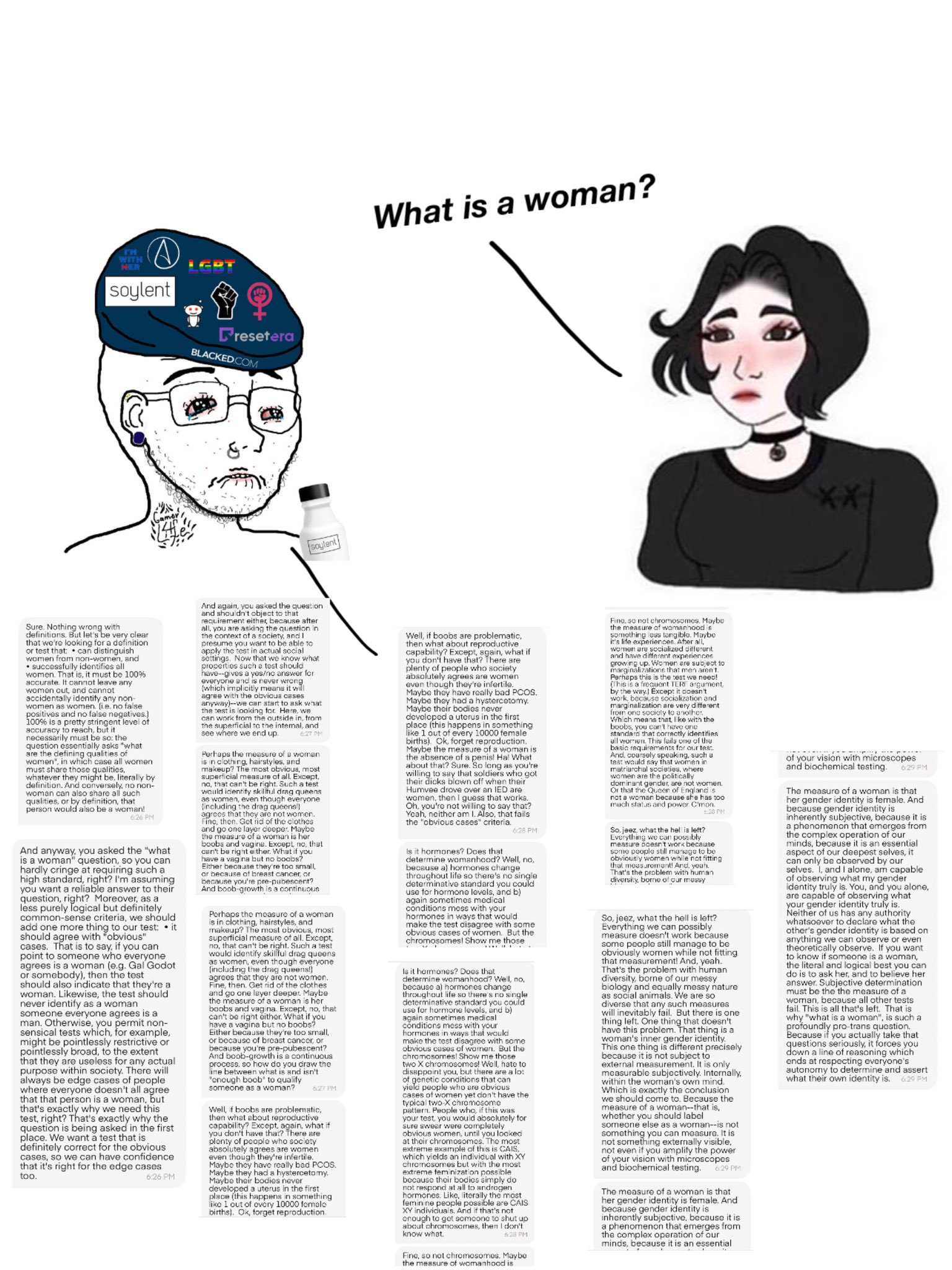 >>735021137>someone you knew for all your life trust and believe random internet strangers with more weight than their own familythe reason it's so hard to break the conditioning is that they use unfalsifiable arguments>if you agree with me, then I'm right>if you don't, you're a hateful bigot who refuses to admit that I'm an Xit's like loaded questions. e.g. "have you stopped beating your wife, yes or no?" and they take "I've never done such a thing" for an answer