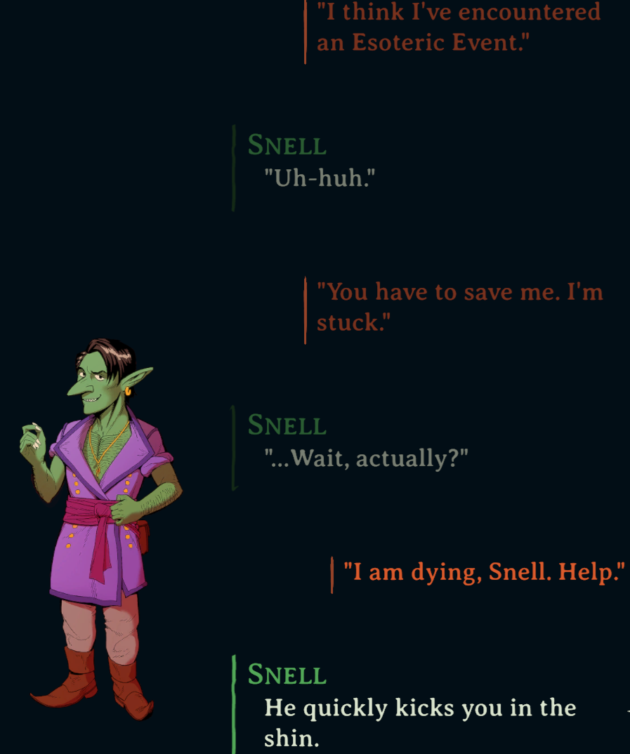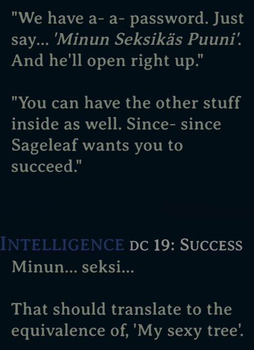 >it's another monologue about random lore I don't give a shit about and will forget exists as soon as the conversation is overHoly shit, I don't think I can take the words, words, words anymore.