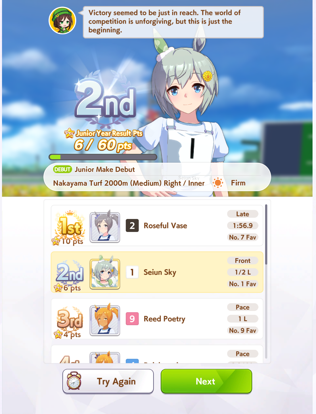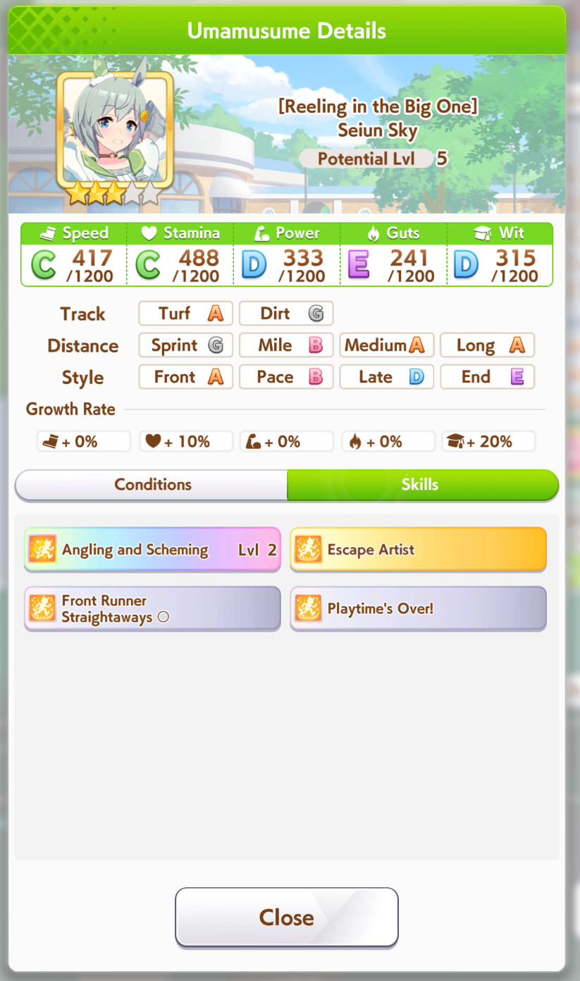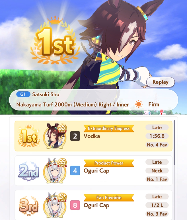 >>735024964>jobbing at the back of career racesShe is pretty strrong in long races, actually. Very often came in 5th in Kikuka sho, beat me several times during fan runs, even