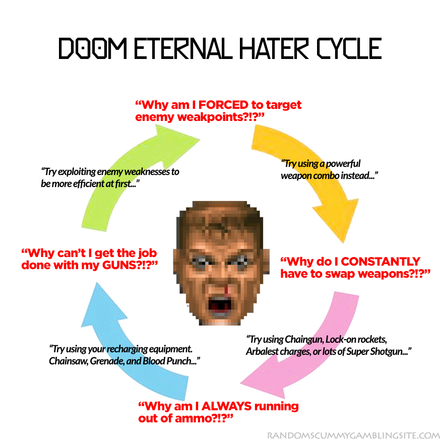 I want to use weapons based on efficiency and circumstance and I want them all to be usefulI do NOT want to juggle weapons just because every single enemy is coded for a specific weaknessresource management? those fodder enemies in every stupid arena fight that you Chainsaw or Glory Kill or Flame Belch or whatever for free ammo don't look like management to mefuck this game