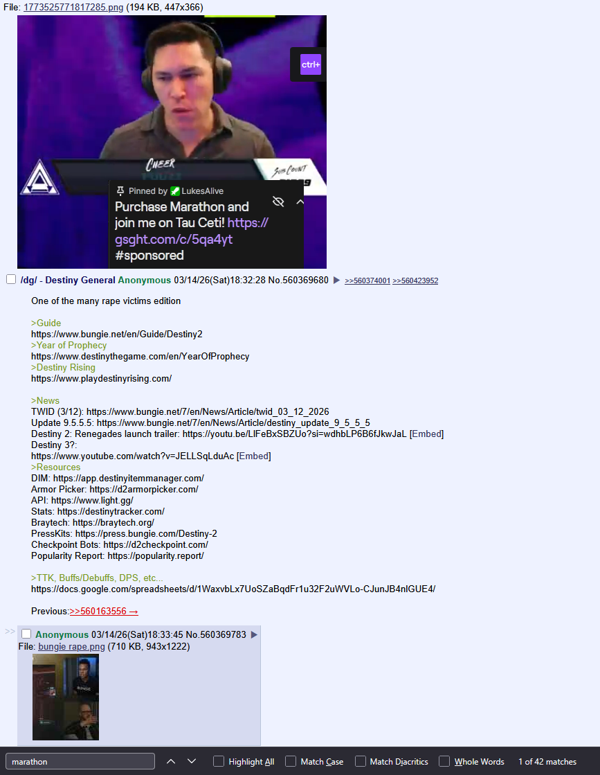 >>735022106he's a destiny fag and those are in a strange positionif marathon is a success, bungie will abandon destiny completely and it will be deader that it already ison the other hand, if marathon fails, bungie will get shutdown and then destiny will truly be dead