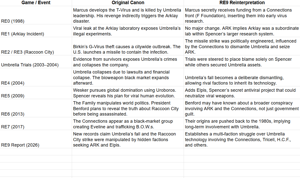 >RE 0, 1, CV, 5 and 6 all being remade just so they can shoe-horn the connections into the old lore.This bum illuminati stuff needs to stop.