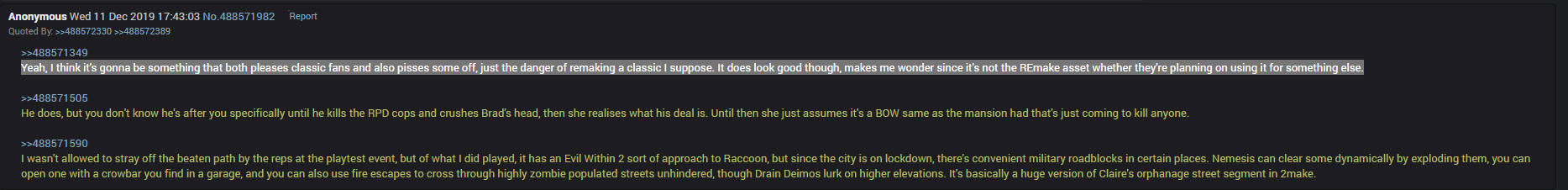 >>735028394>The gameplay of nu-RE doesn't work with fixed camerasRE2 remake has a fixed camera mod so it is possible. In fact I strongly recommend giving the mod a shot just for how terrifying dealing with remake's Mr. X is in fixed camera.It's hard not to think of a RE1 re-remake as a massive homage to classic RE so capcom officially bringing back fixed camera for it would be very fitting. Any concerns Capcom has about fixed camera not having mainstream appeal would be addressed by it simply being an option. And being able to pick perspectives for moving/aiming really would be the best of both worlds.
