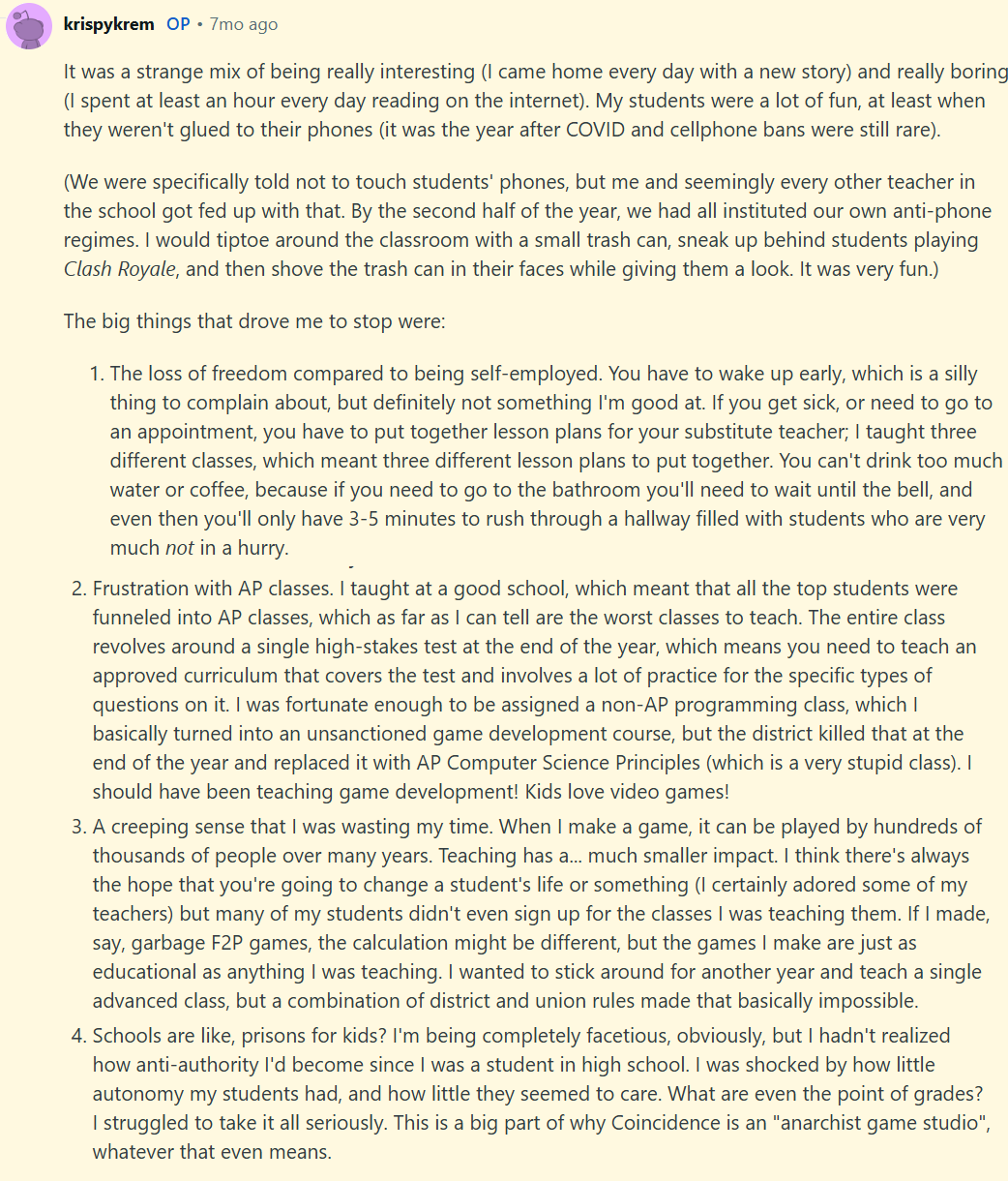>>735034609His reasons were>Kids browse phones too much (fair)>Have to wake up early>AP classes are stupid>Teaching 30 students seems like a waste of time when he can make a game thousands will play>"Schools are prison for kids", I'm an anarchist dude, fuck the policeSeems like only the phones annoyed him and had anything to do with "modern kids being stupid", uncs projecting again