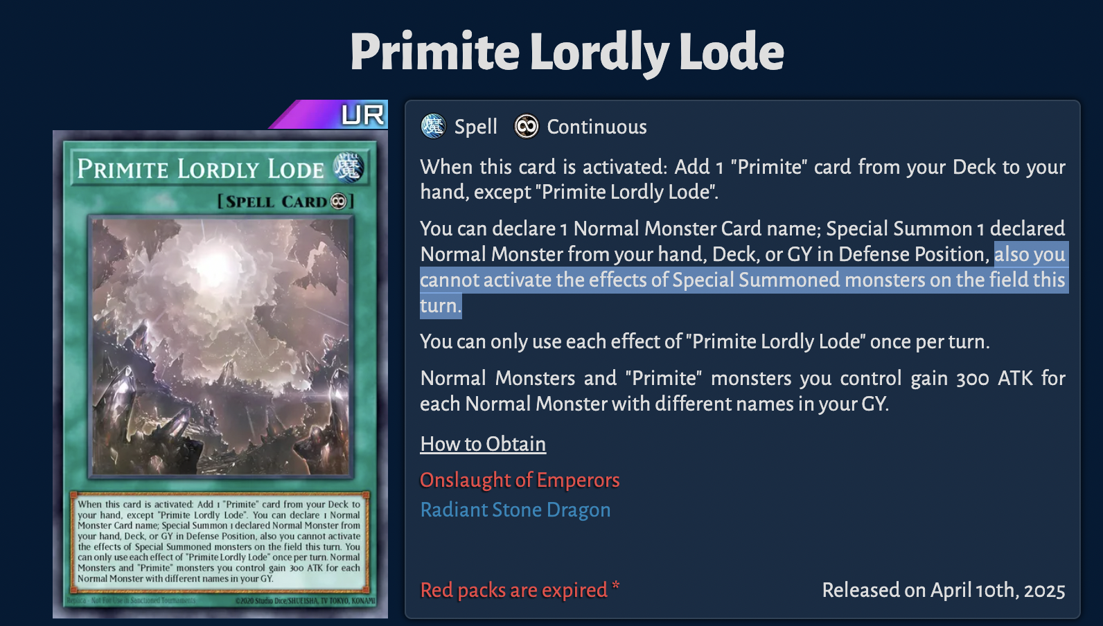 >>735040689Honestly, this card is not that good even if the summon isn't OPT. It feels more like a way to not lose to Nib.It might be worth running 1 just due to the summoning requirement (banish 3 from GY) which is good setup for Bystial Dis Pater.