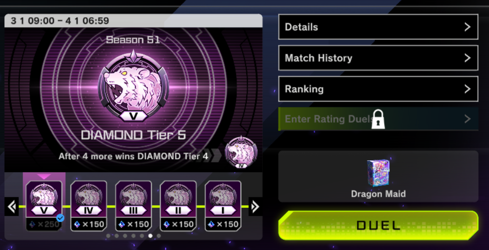 >for the first time in my masterduel career i was able to go diamond>brick by brick of getting level 7,8,9 instead of 4 i pave my way i prefer exosister carrying me to diamond but im still glad that dragonmaid and not a meta deck carried me, im so happy!!