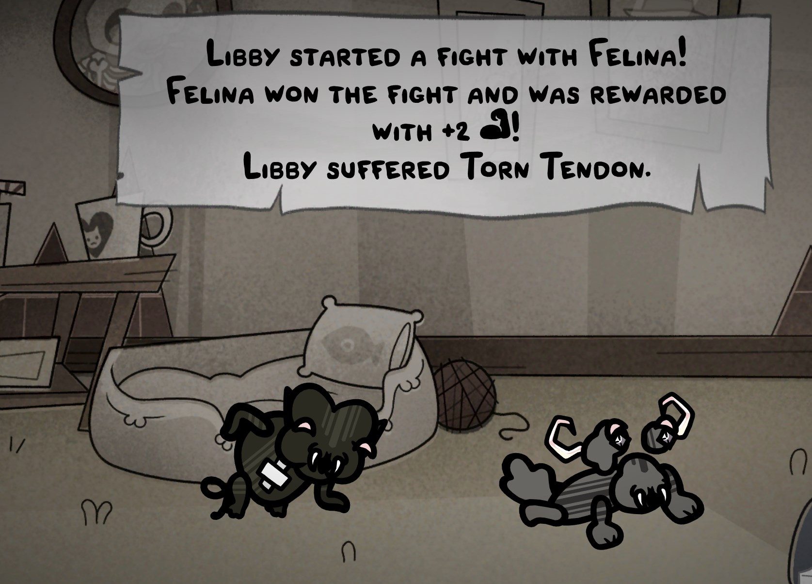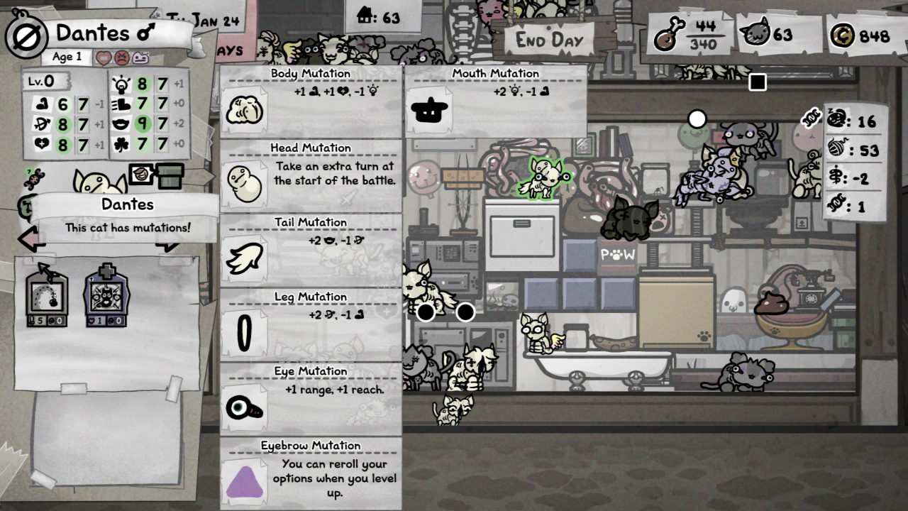every house should have a freak fight pit with chaos idol and max mutation items>pros>can dump unwanted kittens into instead of wasting time on tink>keeps the population down>can get you some funky mutations>farm dead cats and injuries for house upgrades>can produce uberkittens stat wise -1 stat for an injury is nothing if they get +2 for winning-1 stat for a stat you don't even use (ie dex on melee, or vice versa) is a literal non issueand the longer they manage to survive the stronger they get and the stronger they get the less injuries they get cuz they win more fightstruly, survival at its fittest