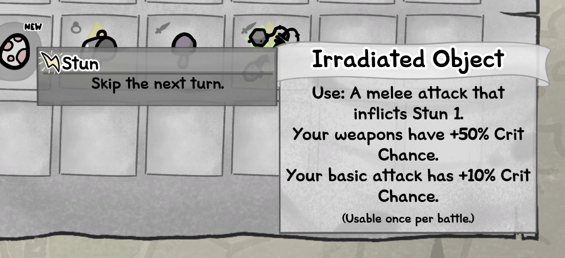 >>735053692Example of a dupe-worthy roll? I can't see it. It's "inflict a status effect" and either a +stat or some other effect that, as mentioned, does not seem to function, and the usable once per battle might not be functional either? Feel like I was using one more than that, can't remember (in which case okay the stun would be legit).