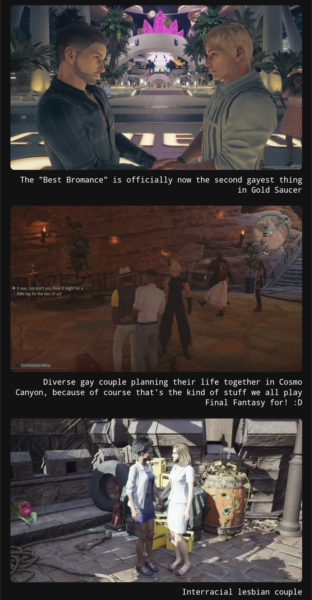 >>735050314>wondering why women do anythingThere's your first mistake, anon.On topic, it didn't fail. Faggots are just pushing that cause they're made they didn't get their 1:1 and the remake is including bits and pieces of all the other lore/games. It is a remake, just not an exact copy, which wouldn't have made sense given all the new lore and history they have added since then. Purists may be mad, but it was a smart idea given everything that has come out. Remake is great is capturing the Midgar feel of the original. Midgar was a slow burn in the original game so no shit they were going to add more and flesh it out. It's one of the most important pieces and location of the series' history. Rebirth feels closer to the source material due to fan complaints from fans but it also already had a lot story bits set up from the original that make sense they could be expanded.>chocobo farm>mythril mine, where it was too good of a location to only be 3/4 areas & a lame Turks encounter>fort condor left for game 3 but built on with minigame>junon is a real locationI could go on, but everything they added save for the time jannies, which will always be somewhat annoying but better than some multiverse/time travel scenarios.