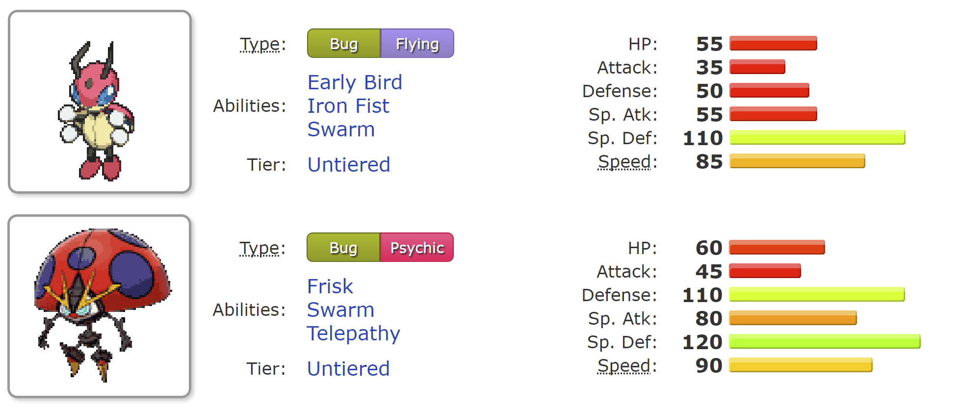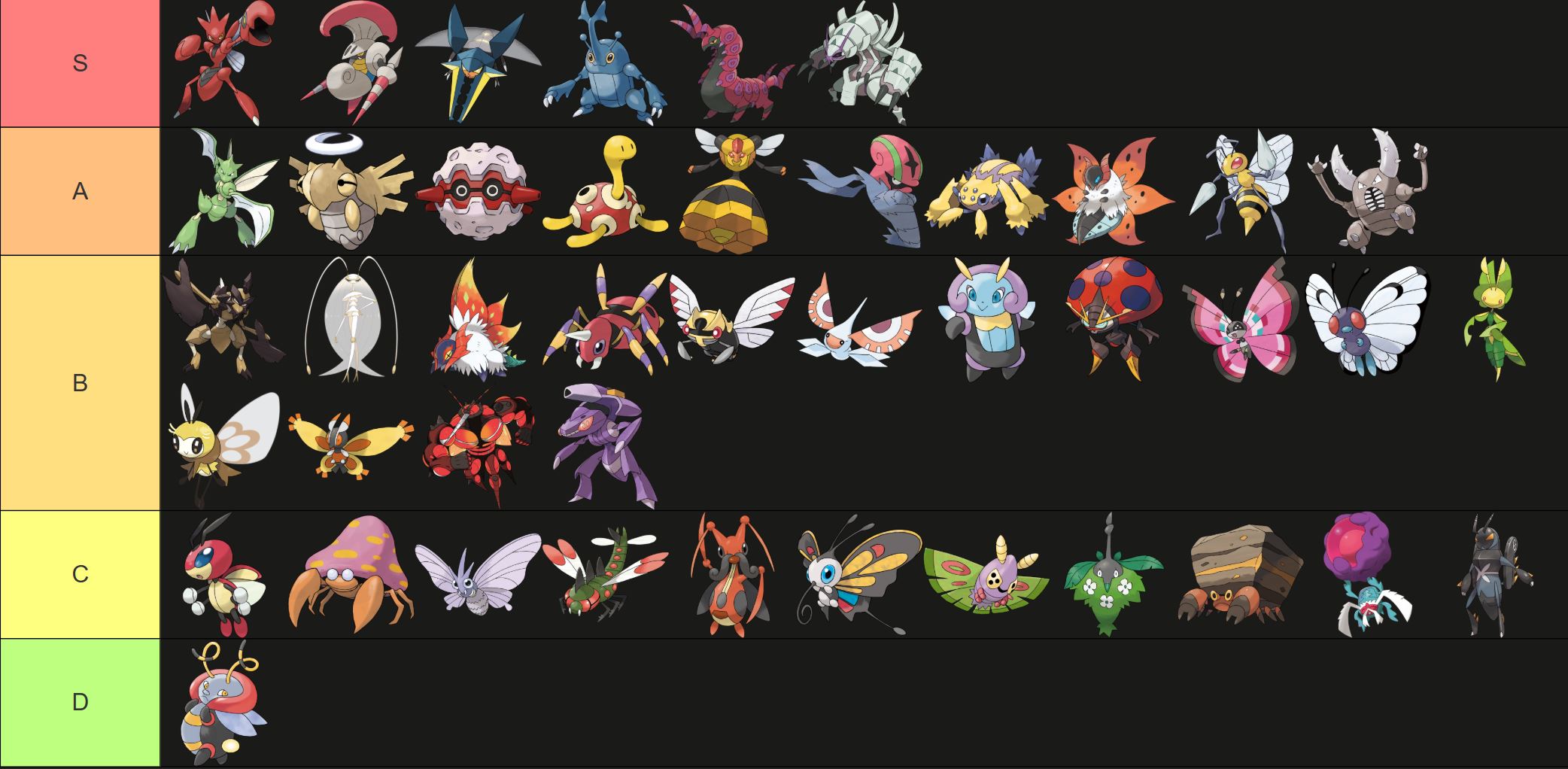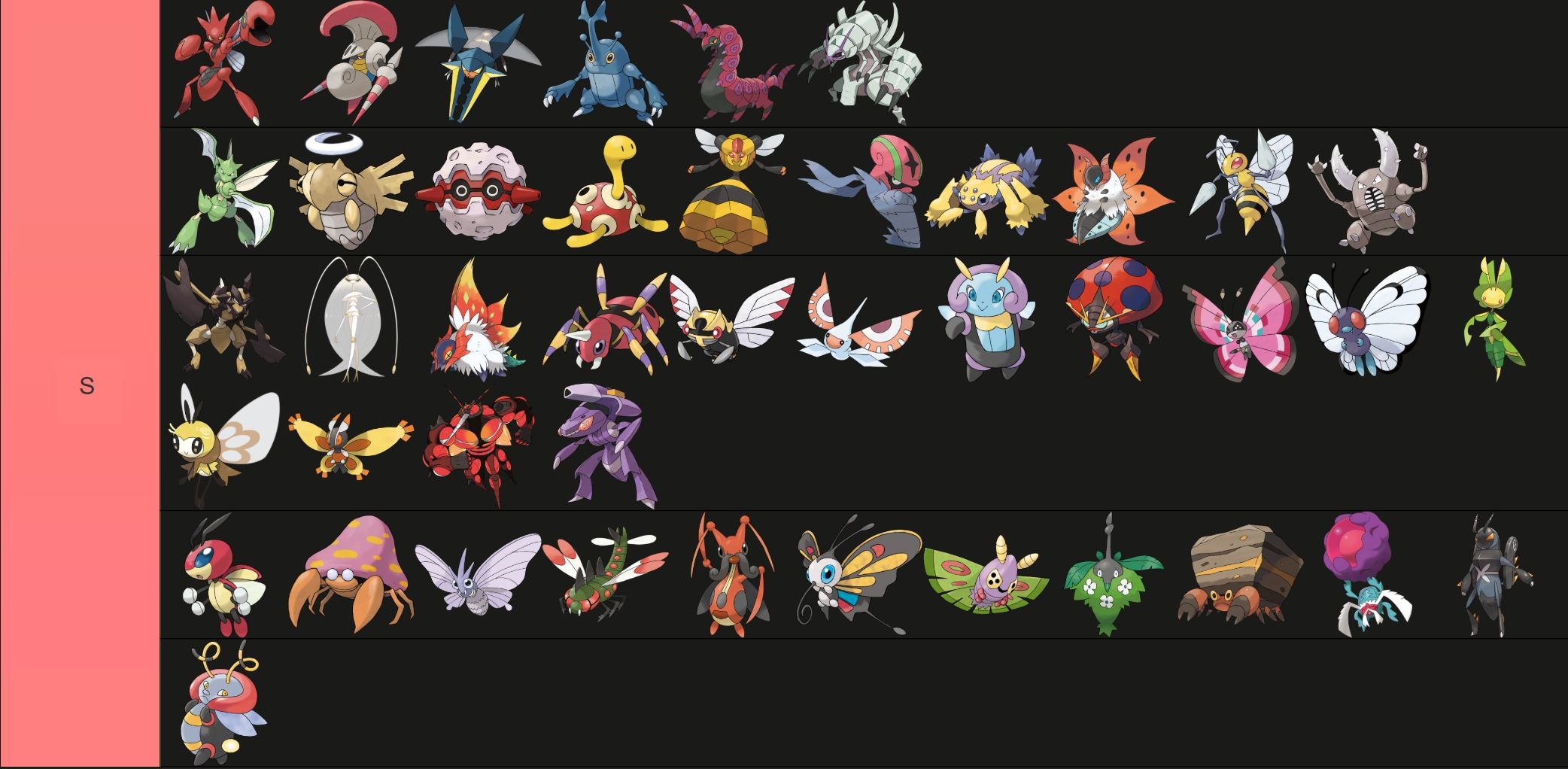 >>735044872pinsir,volcarona and vespiqueen should be on s, pheromosa should be on A or S same with ninjask, the rest I agree