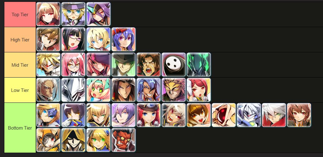 >>735075018>tsubaki, Jin, Mu, Ragna, Hibiki or Amane in bottom tierAwful bait. Almost half of those characters are on the higher end of the tier list and a quarter of that remaining half are mid to low mid tier.