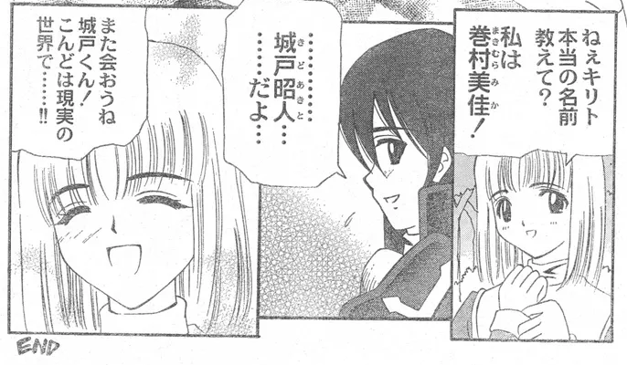 >>735067074and then after a final intimate scene between kirito and mika they tell eachother their real names. mika is similar to asuna where she used her real name in the game. this early version of kirito is named "kido akito" here instead of kirigaya kazuto.