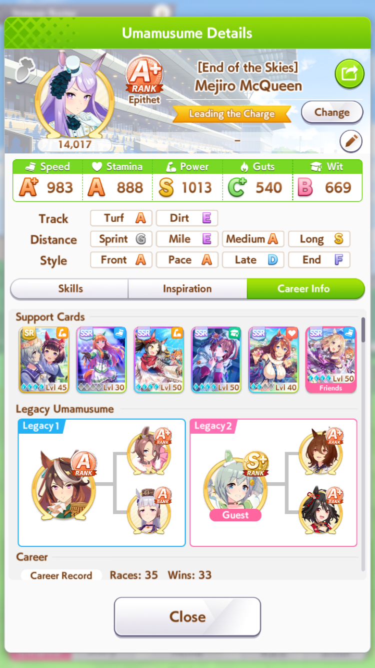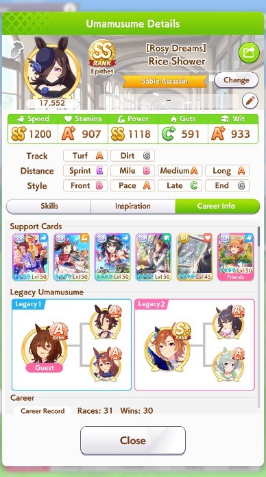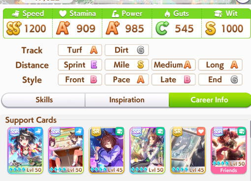 >>735054214You get used to it. Plus a lot of info only applies if you want to compete at the highest level.If you are just starting just focus on finshing a career and reading the stories of the umas. Some of the easiest girls to play are precisely the tutorial girls. It gives you 1 girl that excels at each distance so you get the feel of it, of how each running style plays and what stats you should aim for raising(long is stamina and guts, sprint is speed wit and power, meanwhile regarding stats, end closers really like power, while front runners really like wit)Remember to level up your cards. If you want to compete, you need to start saving to spend your currency on the banner of a good card. It's also good to roll cards, to start getting SR Cards, which are often better than most SSRs. You can roll for umas casually but for cards it's recommended to save at least 1 spark(200 rolls)