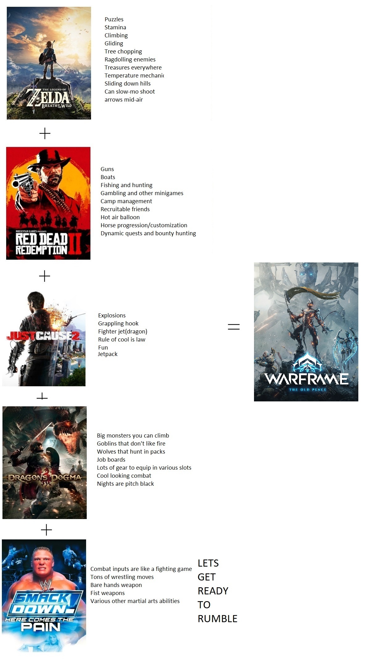 >>735074478>pentajumps>jetpacks>hookshot>advanced combat>dozens of minigames>shrines and puzzles with no yellow paint>hundreds of quests and other shit>team wrestling >tree choppingI think they're pretty different