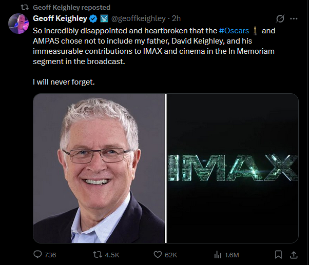 >>735057145They've literally snubbed well known actors for their in memorium bullshit, is Geoff clueless enough to think that anyone even knows who his father was? Of course this retard thinks only of awards shows all day.